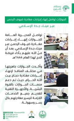تواصل المديرية العامة للجوازات إنهاء إجراءات مغادرة ضيوف الرحمن عبر ميناء جدة الإسلامي، بعد أن منّ الله عليهم بأداء فريضة الحج لهذا العام 1444هـ.