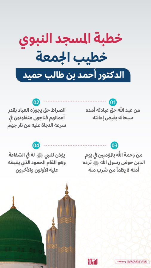 خطب وأمّ المصلين في المسجد النبوي إمام وخطيب المسجد النبوي الشريف الشيخ أحمد بن طالب حميد.