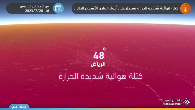 وبحسب التوقعات الحالية، يُتوقع أن تكون درجات الحرارة في مدينة الرياض حول الـ 48 درجة مئوية طيلة أيام الأسبوع الحالي على عُموم المنطقة، بما في ذلك مدينة الرياض، وقد تلامس الـ 50 في بعض الأجزاء الشرقية من الرياض.