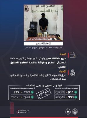 #عسير.. القبض على شخص روّج مادة الحشيش المخدر، وأقراصًا خاضعة لتنظيم التداول الطبي.