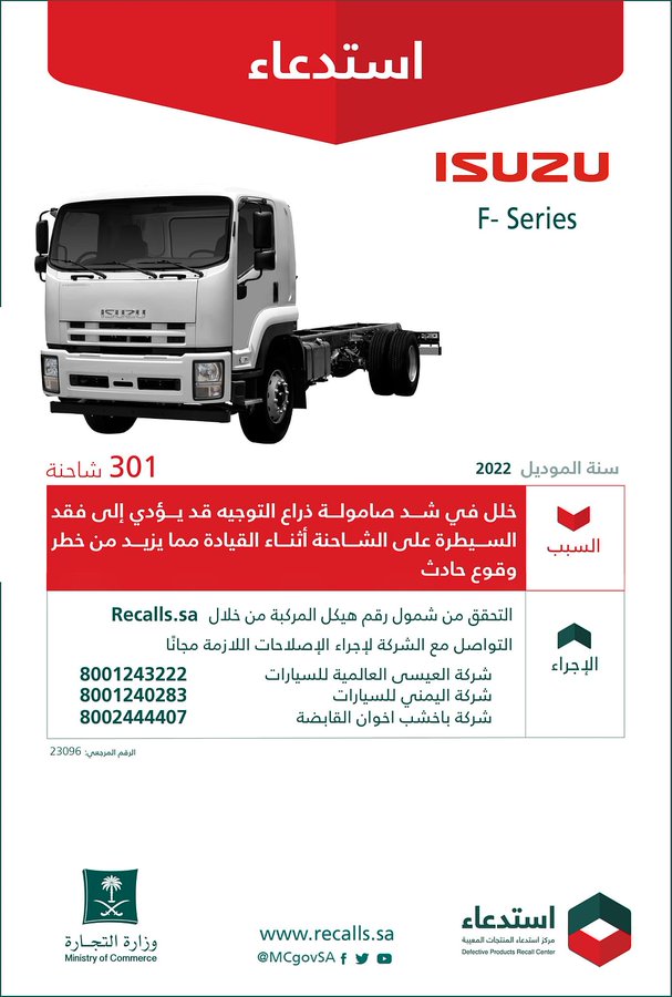 أعلنت وزارة التجارة، استدعاء 301 شاحنة إيسوزو F-Series 2022؛ لخلل في شد صامولة ذراع التوجيه.