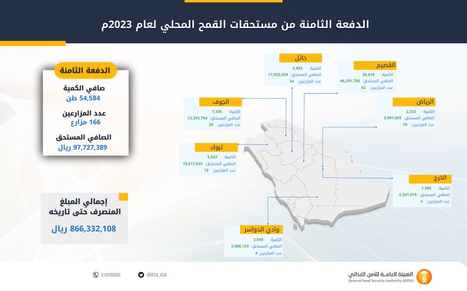 سلمت الهيئة العامة للأمن الغذائي مستحقات الدفعة الثامنة لمزارعي القمح المحلي، شاملة دفعة مستحقي العلاقة التعاقدية بين (المزارعين والشركات الزراعية)، اللذين قاموا بتوريد الكميات المخصصة لهم لهذا الموسم 1444 / 1445هـ (2023م)، وإغلاق حساباتهم عبر المنصة الإلكترونية “محصولي” على الموقع الرسمي للهيئة.