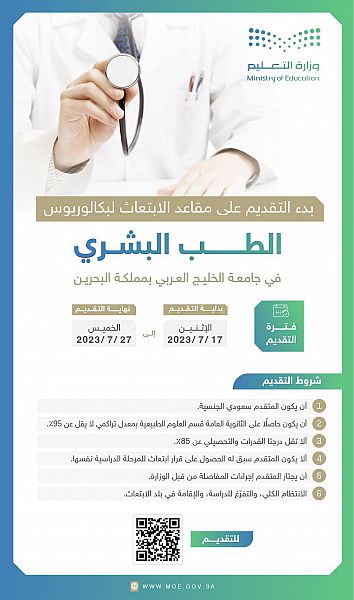 أعلنت وزارة التعليم عن بدء التقديم على مقاعد الابتعاث لدراسة بكالوريوس الطب البشري في جامعة الخليج العربي بمملكة البحرين، ابتداءً من اليوم حتى يوم الخميس 27 يوليو 2023م، وذلك عبر رابط تقديم بوابة سفير2: https://safeer2.moe.gov.sa/ .