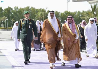 وكان في استقبال سموه بمطار الملك عبدالعزيز الدولي، صاحب السمو الملكي الأمير بدر بن سلطان بن عبدالعزيز نائب أمير منطقة مكة المكرمة، وصاحب السمو الأمير منصور بن خالد بن فرحان سفير خادم الحرمين الشريفين لدى دولة قطر، ومعالي الأمين العام لمجلس التعاون لدول الخليج العربية الأستاذ جاسم محمد البديوي, ومعالي أمين محافظة جدة صالح بن علي التركي، ومدير شرطة منطقة مكة المكرمة اللواء صالح الجابري، ووكيل المراسم الملكية فهد الصهيل.