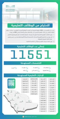 أعلنت وزارة التعليم طرح وظائف شاغرة لـ11551 وظيفة تعليمية للعام الدراسي 1445هـ، في عدد من التخصصات في إدارات التعليم للجنسين بنظام التعاقد، من خلال المنصة الوطنية الموحدة للتوظيف “جدارات”.