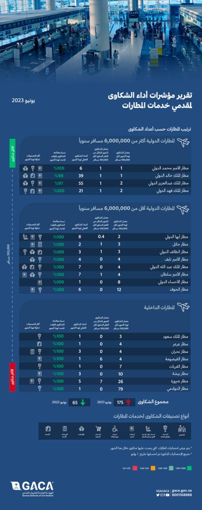 أصدرت الهيئةُ العامة للطيران المدني اليوم، مؤشر تصنيف مقدمي خدمات النقل الجوي والمطارات من واقع عدد الشكاوى المرفوعة من المسافرين للهيئة خلال شهر يونيو 2023م.