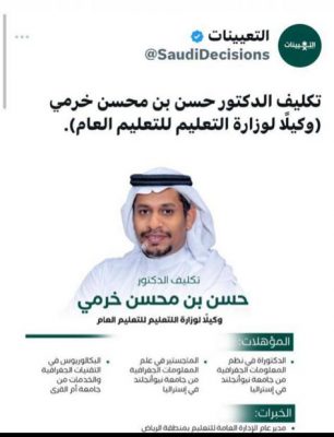 تكليف الدكتور حسن بن محسن خرمي (وكيلًا لوزارة التعليم للتعليم العام).