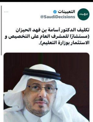تكليف الدكتور أسامة بن فهد الحيزان (مستشارًا للمشرف العام على التخصيص و الاستثمار بوزارة التعليم).