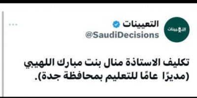 تكليف الاستاذة منال بنت مبارك اللهيبي (مديرًا عامًا للتعليم بمحافظة جدة).