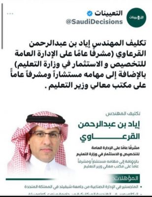 تكليف المهندس إياد بن عبدالرحمن القرعاوي (مشرفًا عامًا على الإدارة العامة للتخصيص و الاستثمار في وزارة التعليم) بالإضافة إلى مهامه مستشاراً ومشرفاً عاماًً على مكتب معالي وزير التعليم .
