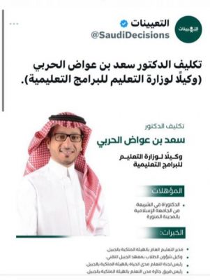 تكليف الدكتور سعد بن عواض الحربي (وكيلًا لوزارة التعليم للبرامج التعليمية).