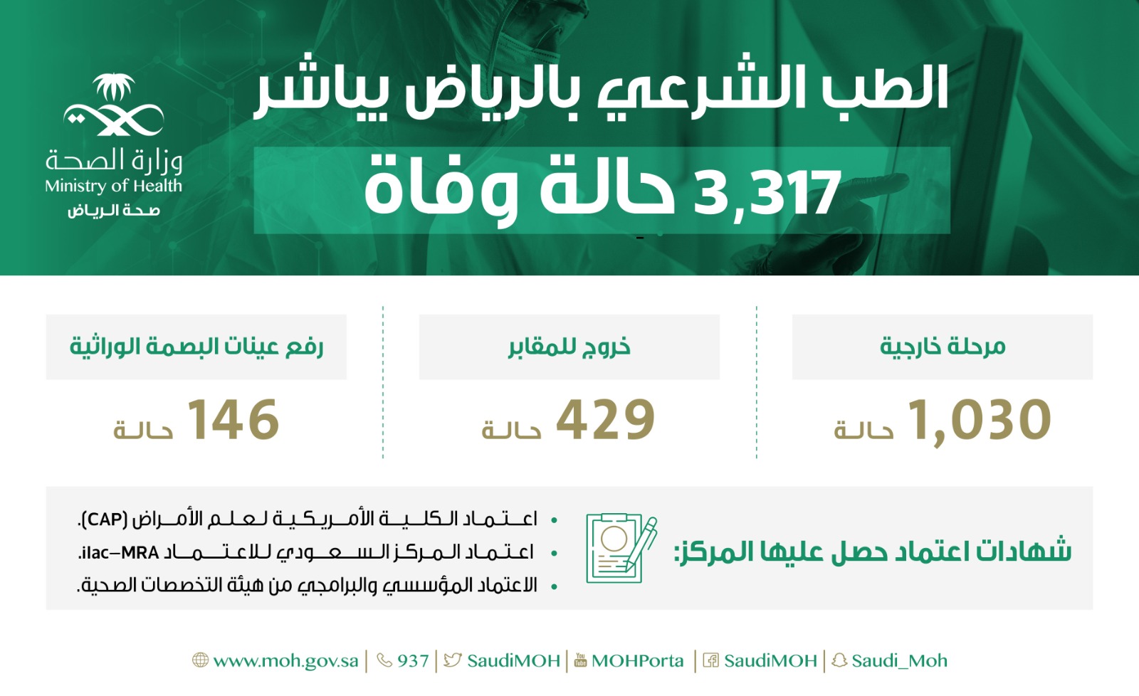 وقالت الوزارة إن عدد الحالات المرحلة إلى خارج المملكة خلال نفس الفترة بلغ (1030) حالة، و(429) حالة تحمل إيذاناً بالخروج إلى المقابر، إضافة إلى (146) حالة لرفع عينات البصمة الوراثية، مشيرة إلى أن مركز الخدمات الطبية الشرعية في منطقة الرياض حصل على شهادات الاعتماد في مجال خدماته المختلفة، ومنها، شهادة اعتماد من الكلية الأمريكية لعلم الأمراض، وشهادة الاعتماد من المركز السعودي للاعتماد، وشهادة الاعتماد المؤسسي والبرامجي من الهيئة السعودية للتخصصات الصحية.