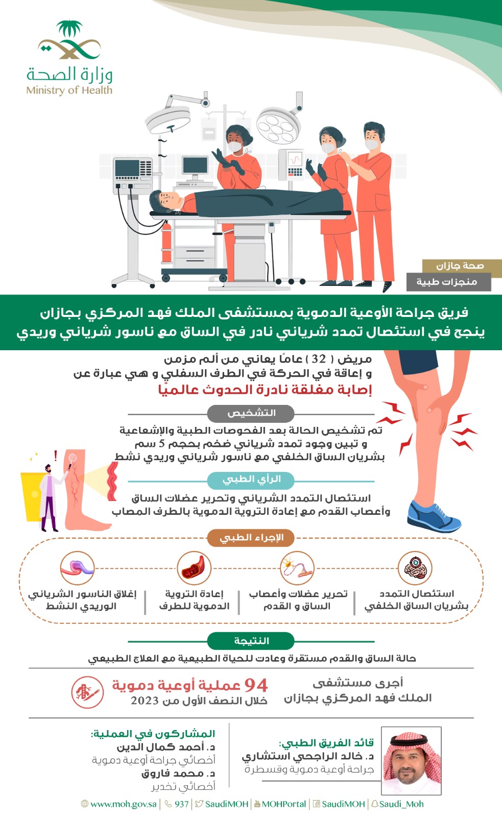 فريق جراحة الأوعية الدموية بمستشفى الملك فهد المركزي بجازان ينجح في استئصال تمدد شرياني نادر في الساق مع ناسور شرياني وريدي