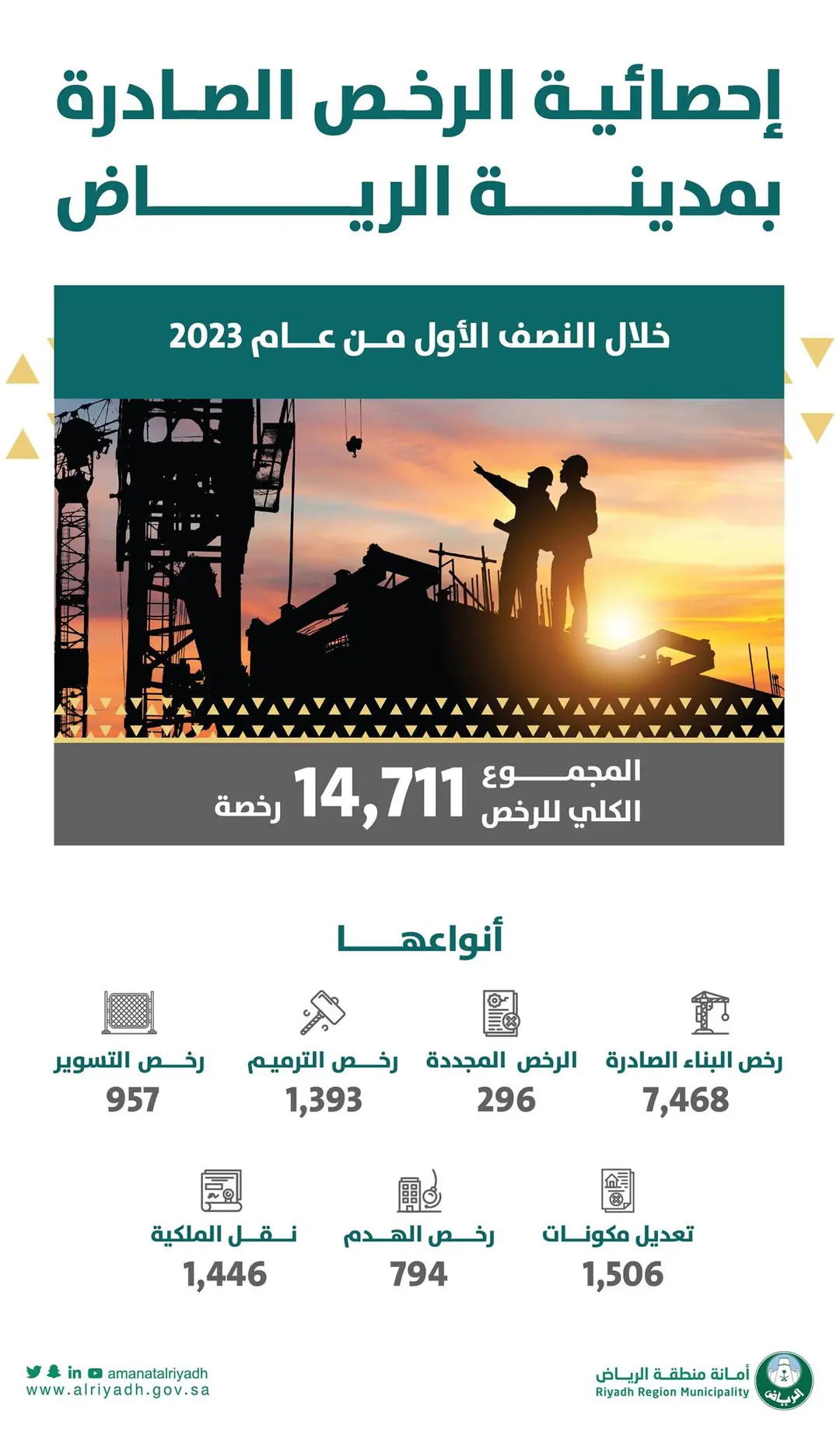 أصدرت أمانة منطقة الرياض 14.711 رخصة خلال النصف الأول من العام 2023م، شملت 7 أنواع تصدرتها رخص البناء بـ 7.468 رخصة، وذلك في إطار الخدمات التي تقدمها الأمانة للمستفيدين بإجراءات ميسرة لتُسهم في مواكبة النمو العمراني المتسارع.