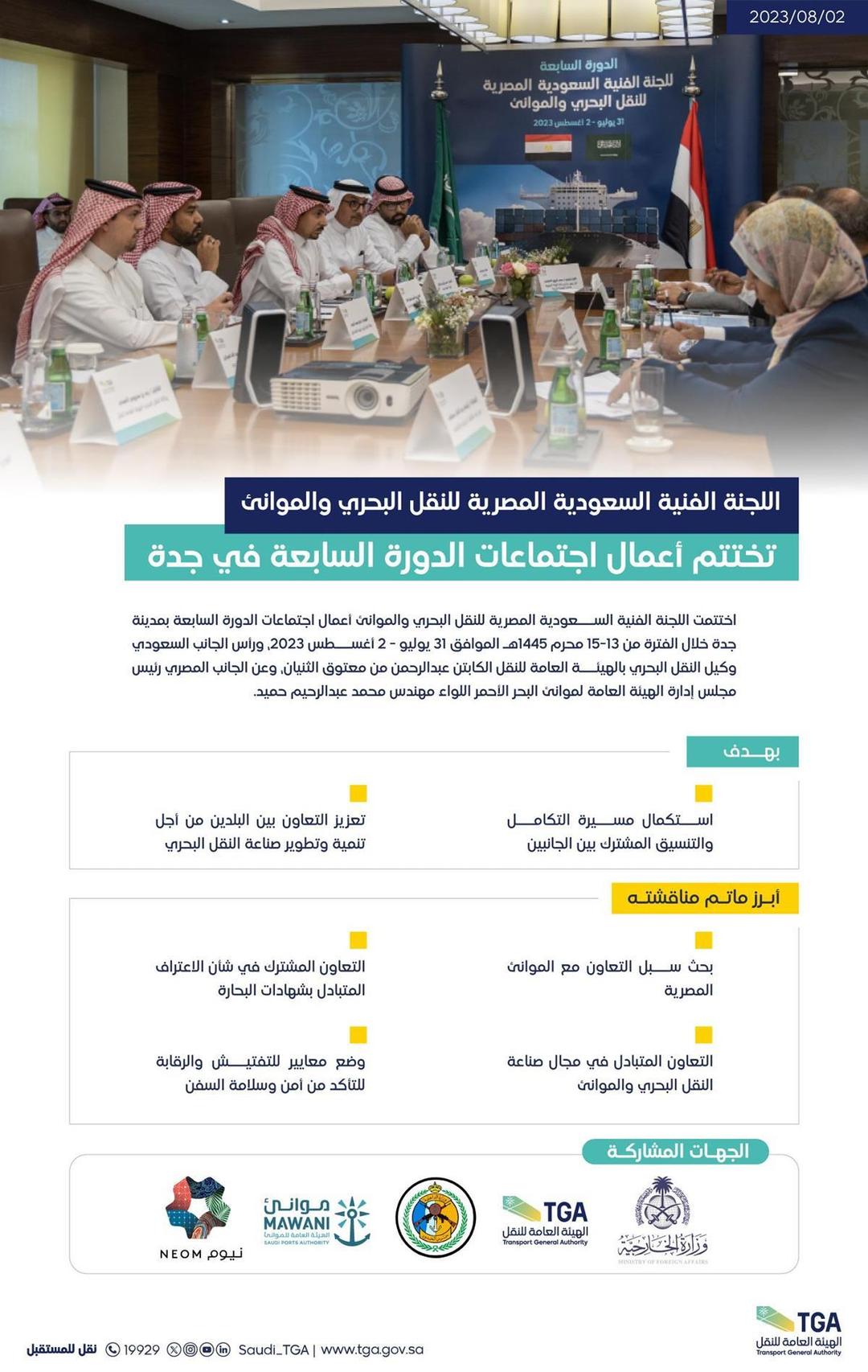 اختتمت اللجنة الفنية السعودية المصرية للنقل البحري والموانئ أعمال اجتماعات الدورة السابعة بمدينة جدة خلال المدة من 31 يوليو – 2 أغسطس 2023.