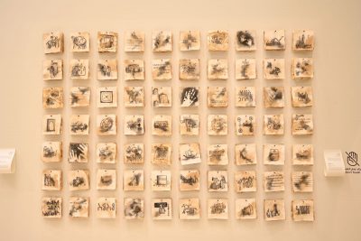 وفي زاوية أخرى من المعرض، تأخذ علاقتنا مع الأرض والطبيعة شكلًا مختلفًا يميل للعاطفة أكثر في العمل الفني المسمى “أول مرة” للفنانة لمى العجلان. تشبّه العجلان الأرض بالأم الحنونة التي توثّق الذكريات الأولى لطفلها، من خلال 70 لوحة قماشية رُسمت عليها رسومات حديثة مستعينةً بأسلوب الرسوم الصخرية المتواجدة في جنوب غرب المملكة. تشرح العجلان سبب اختيارها الرسومات الصخرية للتعبير عن هذه الفكرة، قائلة: “سبب اختياري للرسوم الصخرية أولًا لحبي للفن التجريدي كمدرسة فنية، ولاهتمامي بالحضارات السابقة والإنسان القديم ثانيًا، كما اخترت منطقة حمى تحديدًا لكونها مسجلة حديثًا كسادس موقع ثقافي في المملكة ينضم لقائمة اليونسكو للتراث العالمي لاحتواء المنطقة على عدد هائل من الرسوم والنقوش الصخرية، وكانت موضوع بحث التخرج الخاص بي”.