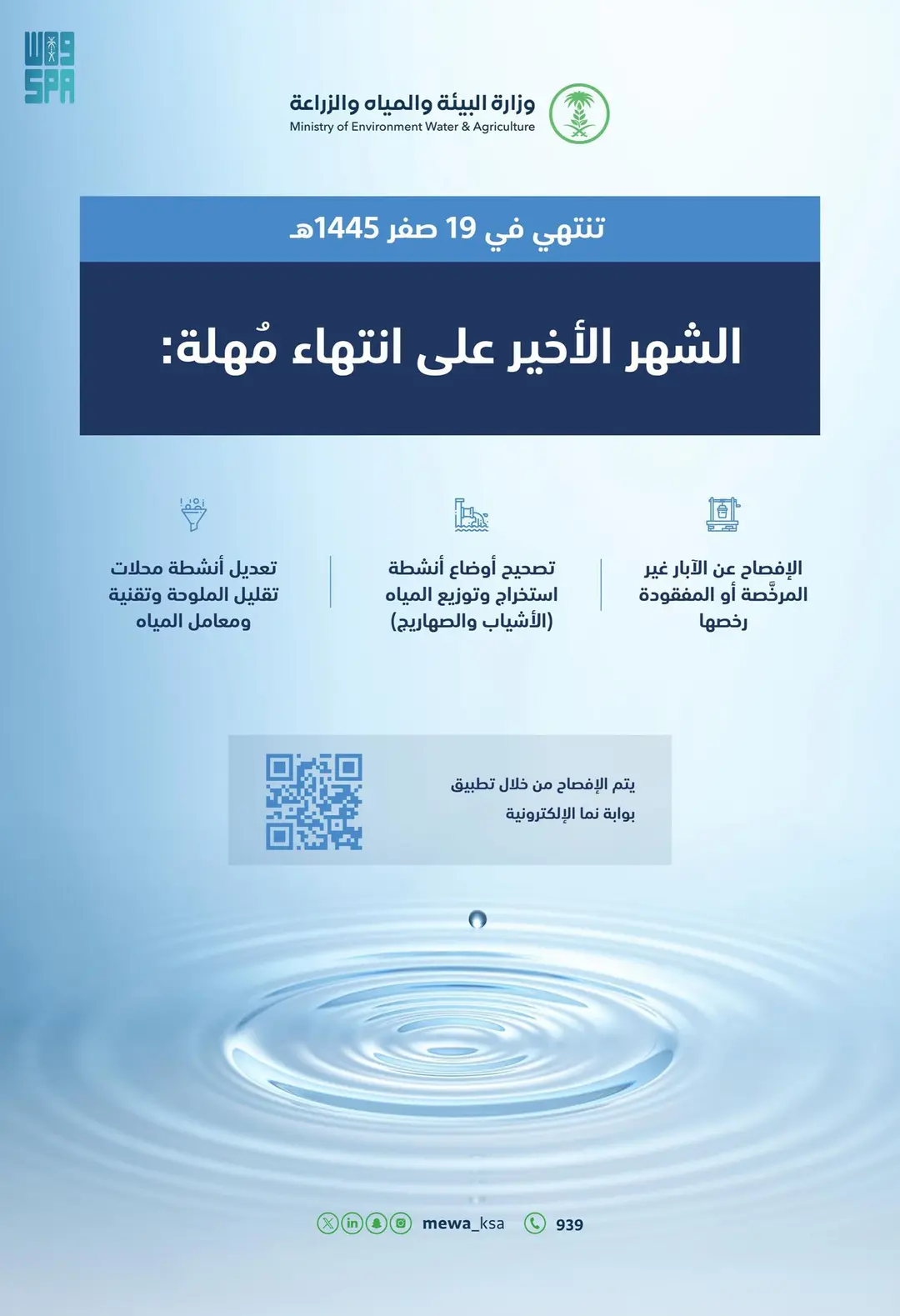 وأوضحت الوزارة أن المُهلة المُنتهية بعد شهر تشمل: الإفصاح عن الآبار غير المرخَّصة أو المفقودة رخصها، وأنشطة استخراج وتوزيع المياه الصالحة للشرب وغير الصالحة للشرب (الأشياب والصهاريج)، وأنشطة محلات تقليل الملوحة، ومعامل المياه، ومحال تنقية المياه.
