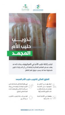 “الغذاء والدواء” تحذّر من إذابة حليب الأم المجمّد بـ “الميكروويف”: يُفقده بعض عناصره الغذائية.