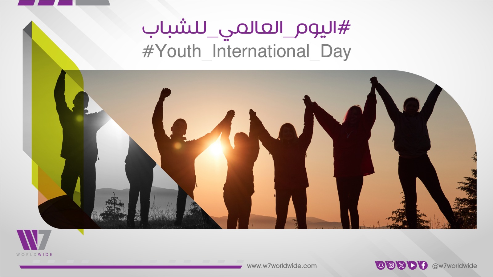 وتزامنًا مع احتفال العالم والمملكة باليوم العالمي للشباب، أنتجت W7Worldwide للاستشارات الاستراتيجية والإعلامية مقطعًا مرئيًّا قصيرًا مدته (31 ثانية) يبرز دور الشباب السعودي وجهودهم في التنمية، لا سيما أن رؤية 2030 تعتمد في كثير من مبادراتها وأهدافها على الشباب (يمكنكم مشاهدة المقطع المرئي هنا: https://youtu.be/i_L4nooZnD4)
