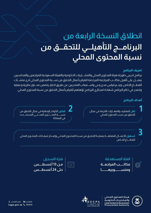 أعلنت هيئة المحتوى المحلي والمشتريات الحكومية عن انطلاق وفتح باب التسجيل في النسخة الرابعة من البرنامج التأهيلي للتحقق من نسبة المحتوى المحلي بدأً من اليوم حتى 24 أغسطس، وذلك امتداداً لاتفاقية التعاون بينها وبين الهيئة السعودية للمراجعين والمحاسبين التي تم توقيعها في عام 2020م، بهدف نقل المعارف والمهارات اللازمة وتمكين الكوادر الوطنية في هذا المجال المستحدث في المملكة.