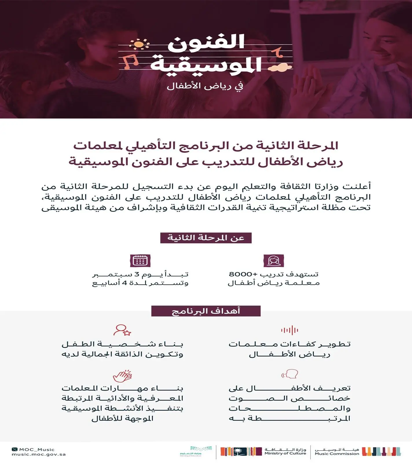 وتأتي هذه المرحلة استكمالاً للنجاح الذي حققته المرحلة الأولى من برنامج تأهيل معلمات رياض الأطفال في مجال الفنون الموسيقية خلال شهر مايو الماضي، والذي شهد مشاركة أكثر من سبعة آلاف معلمة رياض أطفال من المدارس الحكومية والأهلية.