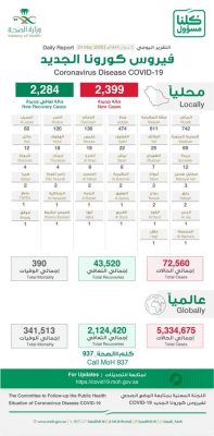 أعلن المتحدث الرسمي باسم وزارة الصحة الدكتور محمد العبدالعالي عن رصد 2399 حالة جديدة بفيروس كورونا المستجد في المملكة.