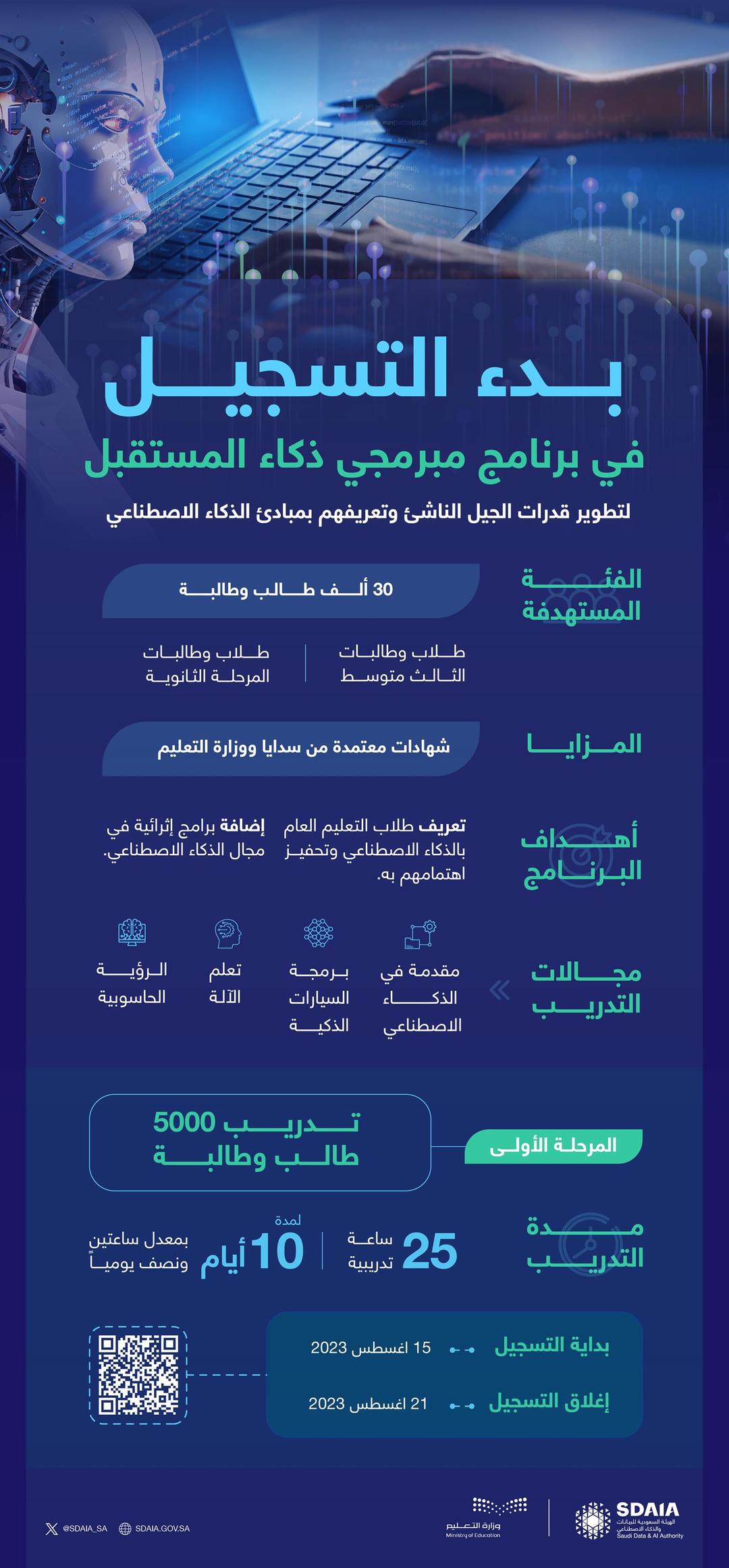 أعلنت الهيئة السعودية للبيانات والذكاء الاصطناعي (سدايا) بالتعاون مع وزارة التعليم عن فتح باب التسجيل اليوم في برنامج مبرمجي ذكاء المستقبل (عن بعد) لتدريب 5 آلاف طالب وطالبة ضمن المرحلة الأولى من البرنامج الذي يستهدف تدريب 30 ألف طالب وطالبة من مرحلتي المتوسط والثانوية في مراحل لاحقة، وذلك على مبادئ تقنيات الذكاء الاصطناعي.