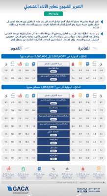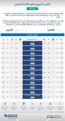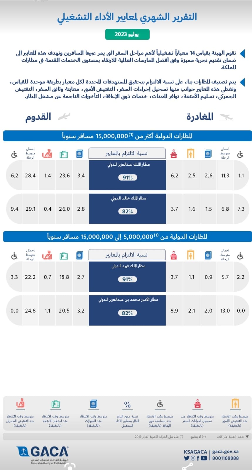 أصدرت الهيئة العامة للطيران المدني اليوم، تقريرها الشهري عن أداء مطارات المملكة الدولية والداخلية، لشهر يوليو 2023م، وفقاً لأربعة عشر معياراً أساسياً لقياس الأداء، وذلك تطبيقاً للتوجُّهات الإستراتيجية التي تستهدف تجويد الخدمات المُقدَّمة للمسافرين، ورفع مستواها، وتحسين تجربة المسافر في مطارات المملكة.