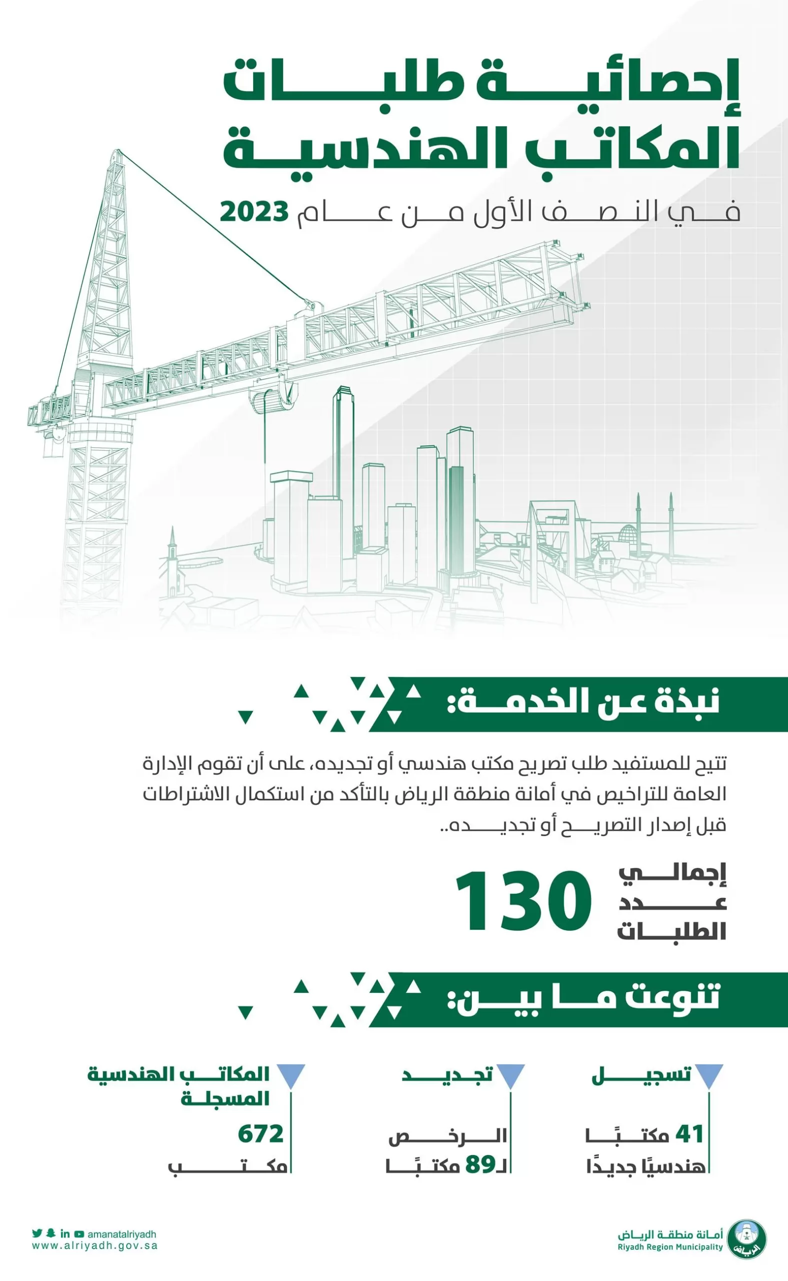 أمانة الرياض تستقبل 130 طلبَ ترخيص وتجديد لمكتب هندسي في النصف الأول لعام 2023م