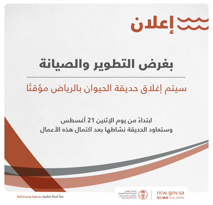أعلن المركز الوطني لتنمية الحياة الفطرية، إغلاق حديقة الحيوان بالرياض مؤقتاً.