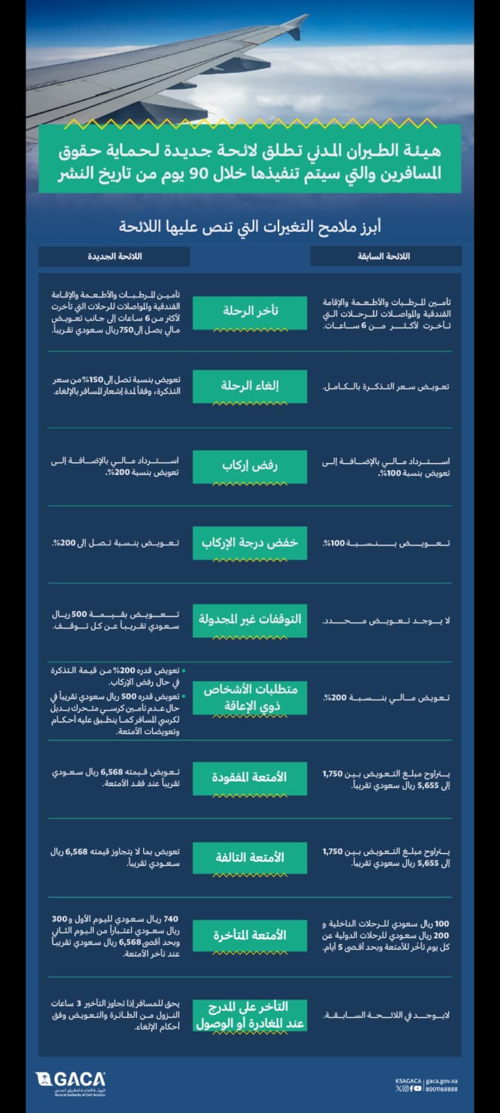 وأكد نائب رئيس الهيئة العامة للطيران المدني للجودة وتجربة المسافر المهندس عبدالعزيز بن عبدالله الدهمش، أن اللائحة الجديدة تعكس اهتمام الهيئة برضى المسافرين وحرصها على الارتقاء بتجربة السفر في سماء المملكة، عبر حماية المسافرين من أي تغيرات مفاجئة في حركة الطيران، وتوفير خيارات أفضل لهم.