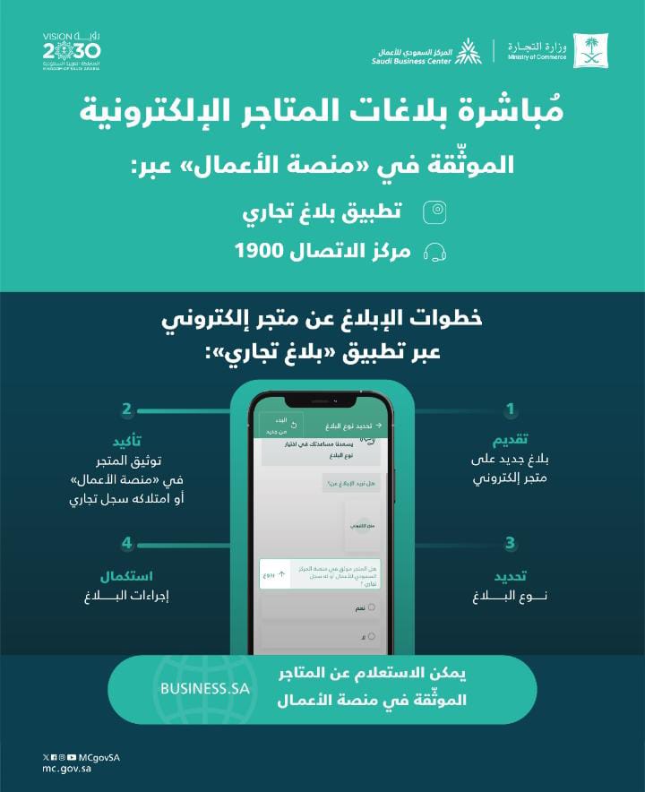 يباشر تطبيق “بلاغ تجاري” ومركز البلاغات 1900 اعتباراً من اليوم بلاغات التجارة الإلكترونية للمتاجر الموثّقة في “منصة الأعمال” التابعة للمركز السعودي للأعمال، والتي تملك شهادة التجارة الإلكترونية، ولديها سجلات تجارية “سارية” أو وثائق عمل حر “سارية”، وحسابات بنكية تجارية مرتبطة بهذه المتاجر الموثّقة.