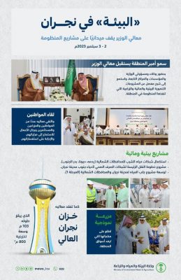 ووقف معاليه ميدانيًا على أعمال توسعة مشروع جلب المياه لمدينة نجران والمحافظات الشمالية (المرحلة الأولى)، وذلك لتنفيذ بئرين بالنقحياء و(4) خزانات تشغيلية بالرويكبة والمشعلية بسعة تبلغ (100) ألف متر مكعب، وكذلك خط ناقل بطول (56.9) كيلو متر، كما تفقد خزان نجران العالي الذي بلغ طوله 103 أمتار، وسعة تخزينية 800 متر مكعب، ووقف على مزرعة ابن شرمة النموذجية واطلع على منتجاتها التي ترفد أسواق المنطقة.