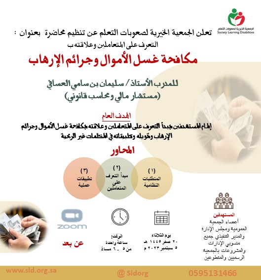 “خيرية صعوبات التعلم” تقيم محاضرة عن التعرف على المتعاملين وعلاقته بمكافحة غسل الأموال وجرائم الإرهاب
