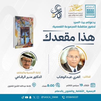 وسيقدم بيت السرد الثلاثاء المقبل جلسة لمناقشة المجموعة القصصية هذا مقعدك للكاتب العربي عبدالوهاب، ويدير اللقاء والملخص الدكتور منير الرفاعي، وستنضم لجنة المسرح الأحد المقبل ١٧ سبتمبر المقهى المسرحي تحت عنوان (المسرح بدون مسرح.. المسرح المدرسي) بمشاركة كل من أ/ معتز العبدالله، أ/ صقر القرني، وأ/ أحمد القادري.