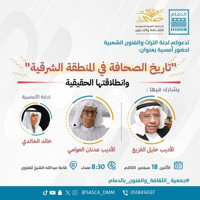 وتناقش لجنة التراث والفنون الشعبية في جمعية الثقافة والفنون بالدمام مساء الأثنين القادم ٣ ربيع الأول ١٤٣٤ الموافق ١٨سبتمبر ٢٠٢٣م بندوة حوارية الإنطلاقة الحقيقية للصحافة في تمام الساعة الثامنة والنصف مساءً، بقاعة عبدالله الشيخ للفنون.