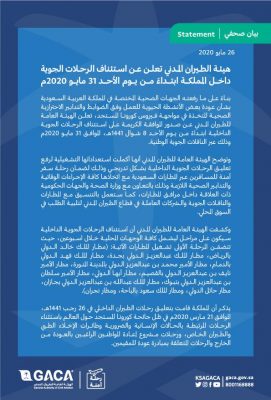 هيئة الطيران المدني تعلن عن استئناف الرحلات الجوية داخل المملكة ابتداء من يوم الأحد 31 مايو 2020م بناء على ما رفعته الجهات الصحية المختصة في المملكة العربية السعودية بشأن عودة بعض الأنشطة الحيوية للعمل وفق الضوابط والتدابير الاحترازية الصحية المتخذة في مواجهة فيروس كورونا المستجد، تعلن الهيئة العامة للطيران المدني عن صدور الموافقة الكريمة على استئناف الرحلات الجوية الداخلية ابتداء من يوم الأحد 8 شوال 1447ه، الموافق 31 مايو 2020م وذلك عبر التاقلات الجوية الوطنية.