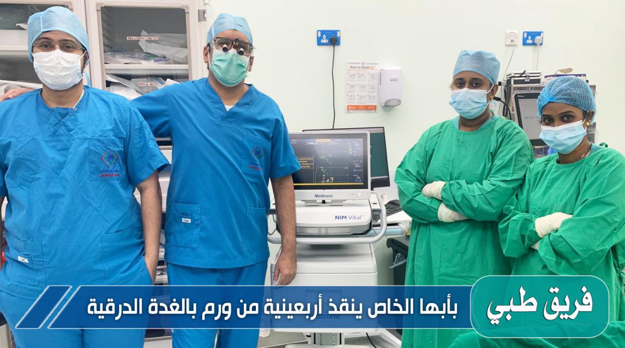 نجح فريق طبي بمستشفى أبها الخاص العالمي بقيادة استشاري الجراحة العامة وجراحة الغدد الصماء الدكتور حسن الزهراني والفريق الطبي المكون من طواقم التخدير والتمريض بإشراف الدكتور عبدالرحمن النحاس ، بأجراء أول عملية ناجحة لاستئصال كامل للغدة الدرقية باستخدام تقنية المراقبة العصبية لمريضة أربعينية تعاني من ورم بالغدة الدرقية مع أعراض صعوبة البلع والتنفس .