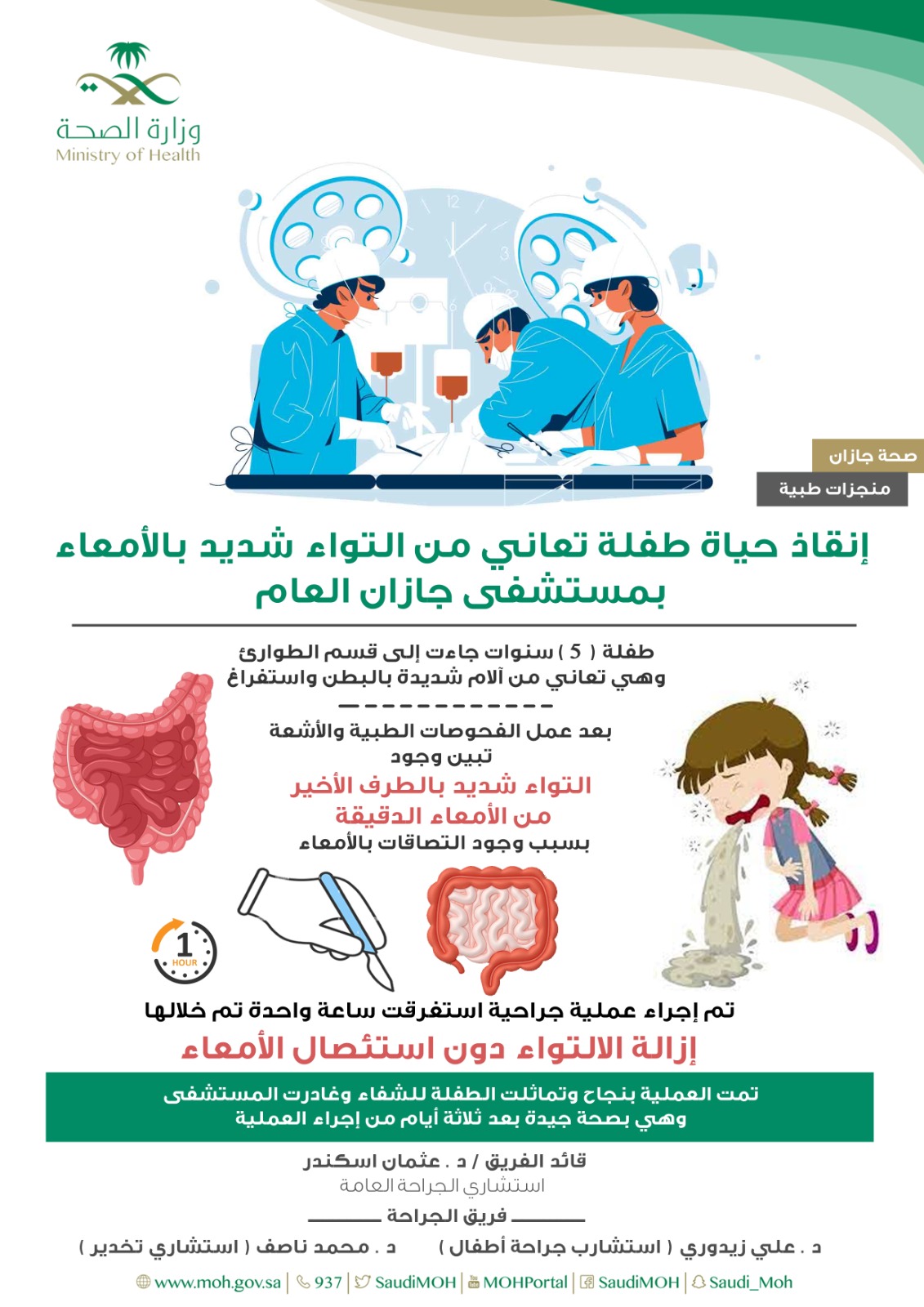 وأفاد الصحة بأنه تم إجراء عملية جراحية استغرقت ساعة واحدة تم خلالها إزالة الالتواء دون استئصال الأمعاء بقيادة الفريق الطبي / د. عثمان اسكندر استشاري الجراحة العامة ، د. علي زيدوري استشاري جراحة أطفال ، ود. محمد ناصف استشاري تخدير .
