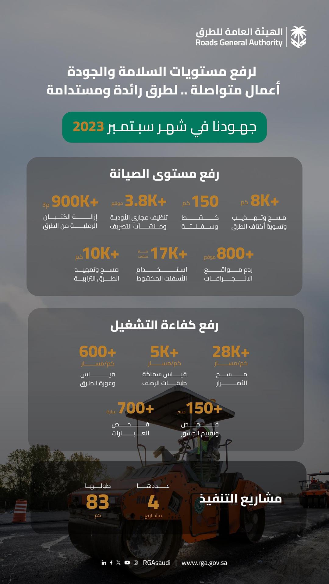 ورُفع مستوى الصيانة على الطرق من خلال مسح وتهذيب وتسوية أكتافها بحوالي 8000 كم، إضافةً لكشط وسفلتة 150 كم، وتنظيف مجاري الأودية بأكثر من 3800 موقع، كما أزيلت الكثبان الرملية بأكثر من 9000 مربع؛ بالإضافة لردم أكثر من 800 موقع للانجرافات، واستخدام أكثر من 17 ألف متر مكعب من الإسفلت المكشوط ومسح وتمهيد الطرق الترابية بأكثر من 10 آلاف كم. وفي رفع كفاءة التشغيل مسحت الأضرار بأكثر من 28 ألف كم/مسار؛ بالإضافة لقياس سماكة طبقات الرصف بأكثر من 5 آلاف كم/مسار؛ كما قيست وعورة الطرق بما يزيد عن 600 كم/مسار وتم فحص وتقييم أكثر من 150 جسراً وفحص ما يزيد عن 700 عبارة.
