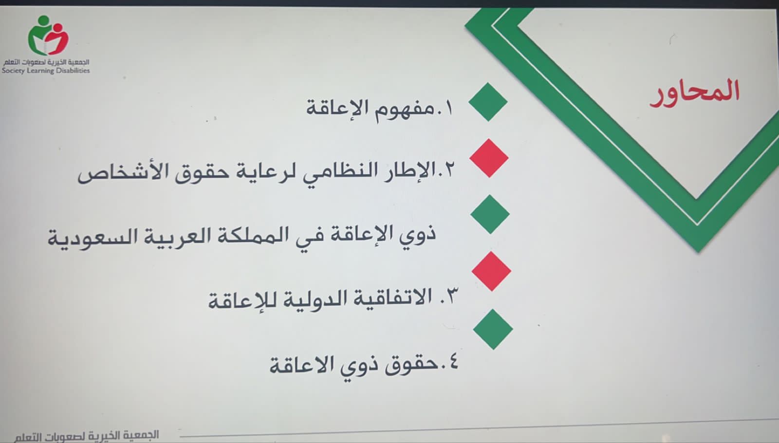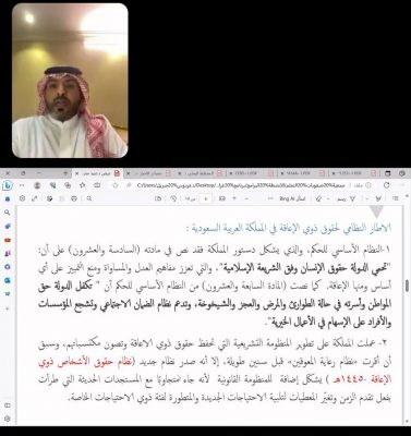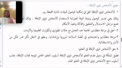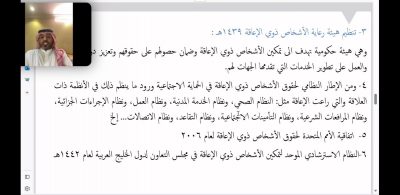 نفذت الجمعيةالخيرية لصعوبات التعلم لقاء توعوي (حقوق ذوي الإعاقة) ضمن برنامج غراس قدمه المستشار القانوني المحامي عبيد سرحان الشبوي (عن بعد) بحضور عدد من المتخصصين والتربويين وأولياء الأمور والمهتمين، حيث استعرض فيها عن مفهوم الإعاقة، حسب ما ورد في الأنظمة الخاصة بذلك، كما بين الحقوق التي أوجبها النظام للأشخاص ذوي الإعاقة ومنها الحق في الصحة والتعليم والعمل إلى… آلخ.