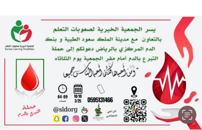 نفذت الجمعية الخيرية لصعوبات التعلم حملة تبرع بالدم تحت شعار (دماؤنا فداء للوطن) بالتعاون مع مدينة الملك سعود بالشميسي، والبنك المركزي للدم أمام مقر الجمعية في حي المصيف.