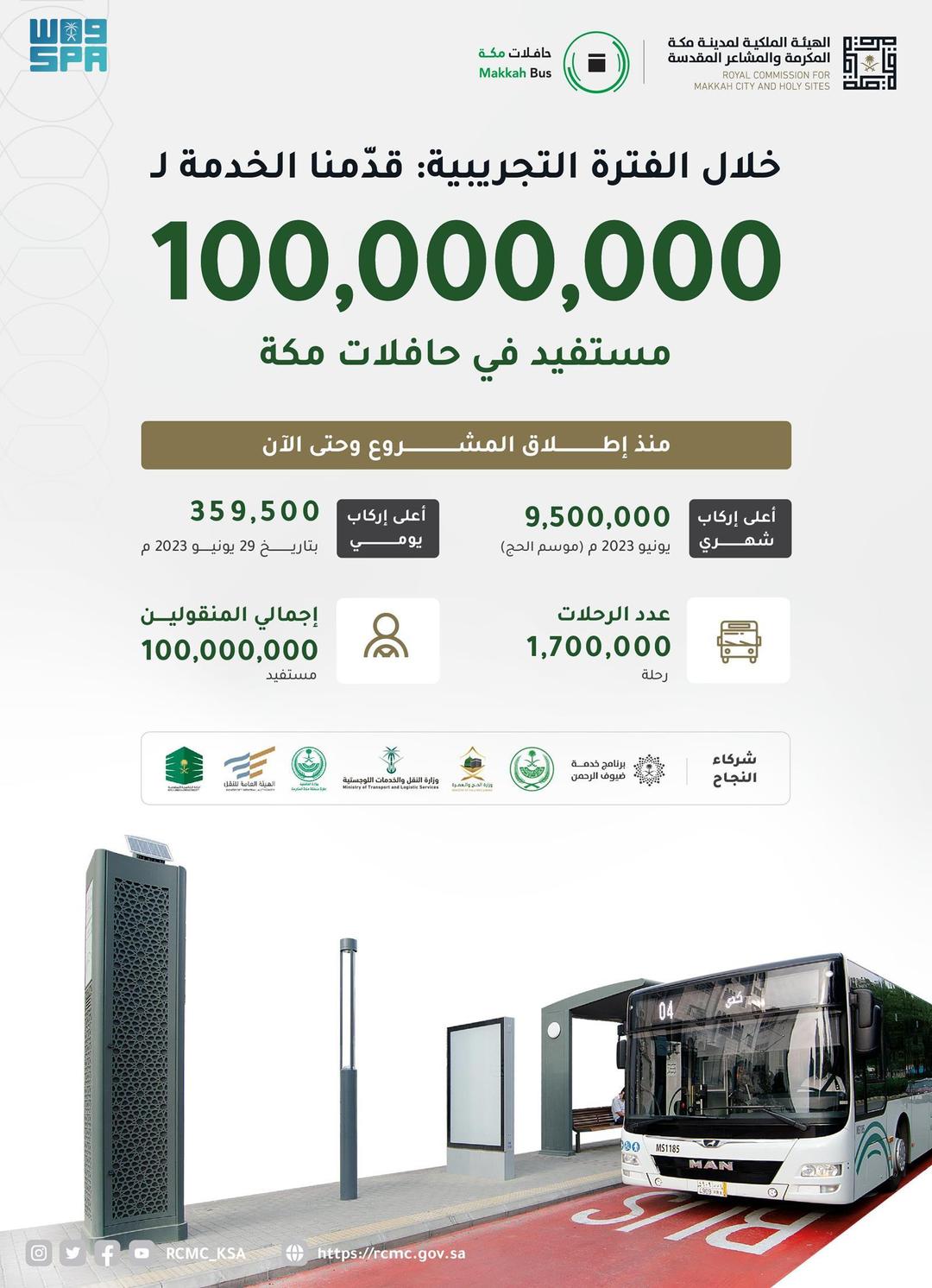 أعلنت الهيئة الملكية لمدينة مكة المكرمة والمشاعر المُقدسة عن خدمة 100,000,000 مستفيد في حافلات مكة بعدد رحلاتٍ تجاوز 1,700,000 رحلة، استفاد منها سكان وزائري مدينة مكة المكرمة، لتكون ضمن أكثر خدمات النقل العام استخدامًا على مستوى الشرق الأوسط وشمال أفريقيا خلال مدة زمنية مقدارها عام ونصف.