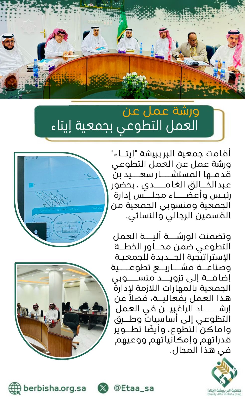 أقامت جمعية البر ببيشة “إيتاء” ورشة عمل عن العمل التطوعي قدمها المستشار سعيد بن عبدالخالق الغامدي ، بحضور رئيس وأعضاء مجلس إدارة الجمعية ومنسوبي الجمعية من القسمين الرجالي والنسائي.