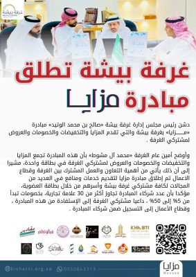 دشن رئيس مجلس إدارة غرفة بيشة «صالح بن محمد الوتيد» مبادرة «مــــــــزايا» بغرفة بيشة والتي تقدم المزايا والتخفيضات والخصومات والعروض لمشتركي الغرفة .