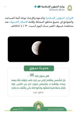 “الشؤون الإسلامية” توجه بإقامة صلاة الخسوف حال رؤيته في مناطق المملكة .. الليلة