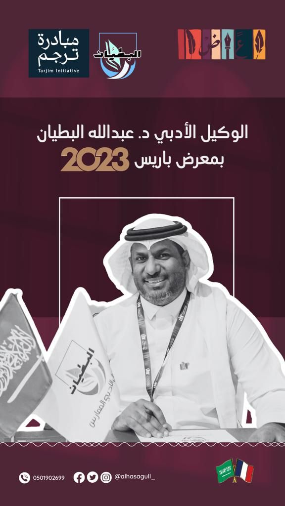 ، أجنحة الأدب، نوافذ من حياتي الجزء الثاني، مع ما يماثلها في الأدب الفرنسي و بالتعاون مع عدد من المؤلفين ودور نشر سعودية نحو مبادرة ترجم السعودية، هذه التجربة تمت بخطة عمل تمتد لثلاث سنوات للنشر والتوزيع بعد اعتمادات مشاريع الترجمة ونشر الثقافة السعودية المتقدمة والمتحضرة في آن واحد، وذلك تعزيز لما وسمته اليونسكو بأن الأحساء موقع تراث عالمي، مشهد ثقافي متطور يتقدم العناوين عدد متنوع من الإصدارات السعودية الأحسائية، حيث أن منصة ترجم في جناح هيئة الأدب والنشر والترجمة ستكون حافلة بالمنجزات نظير هذا الأثر الثقافي، بدورة قال الدكتور عبدالله البطيان بأنني سعيد على المستوى الشخصي بهذه المشاركة الادبية والثقافية والتي تنقل في المقام الاول ما وصلت إليه الثقافة والادب السعودي بشكل خاص والعربي بشكل عام، حيث انه وبعد النجاح الكبير في تجربة بكين وتلمس اثرها الايجابي وجدنا من الاهمية بمكان المشاركة في المعارض القادمة والذي كان معرض باريس لتقديم الاثراء الثقافي في الأدب السعودي والعربي، واستطرد قائلاً اقدم الشكر لمقام خادم الحرمين الشريفين وسمو ولي العهد عراب الرؤية للأهتمام الكبير بأيصال صوت الثقافة والادب السعودي والعربي لابعد افق في الكرة الارضية، كما اشكر وزارة الثقافة والاعلام وهيئة الأدب والنشر والترجمة على الاهتمام الخاص بالمشاركة في مثل هذه المعارض العالمية والتي لاشك بأن لها الأثر الايجابي في نشر الثقافة السعودية بشكل خاص والعربية بشكل عام.