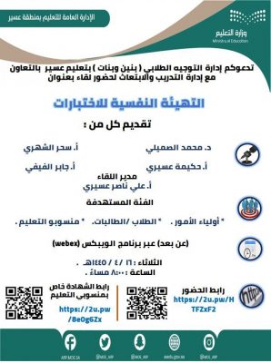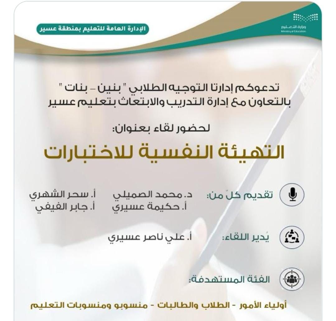 تقيم الإدارة العامة للتعليم بمنطقة عسير يوم الثلاثاء ١٦ ربيع الثاني ١٤٤٥ للهجرة ممثلة في إدارة التوجيه الطلابي لقاء تربوي بعنوان “التهيئة النفسية للاختبارات” يستهدف البرنامج منسوبي التعليم من معلمين ومعلمات وطلاب وطالبات وأولياء أمور المشاركون في البرنامج الدكتور محمد بن حسين الصميلي والأستاذ جابر الفيفي والأستاذة حكيمة عسيري والأستاذة سحر الشهري يدير اللقاء الأستاذ علي بن ناصر بن مفرح العسيري يأتي هذا البرنامج من ضمن برامج التوجيه الطلابي بمنطقة عسير