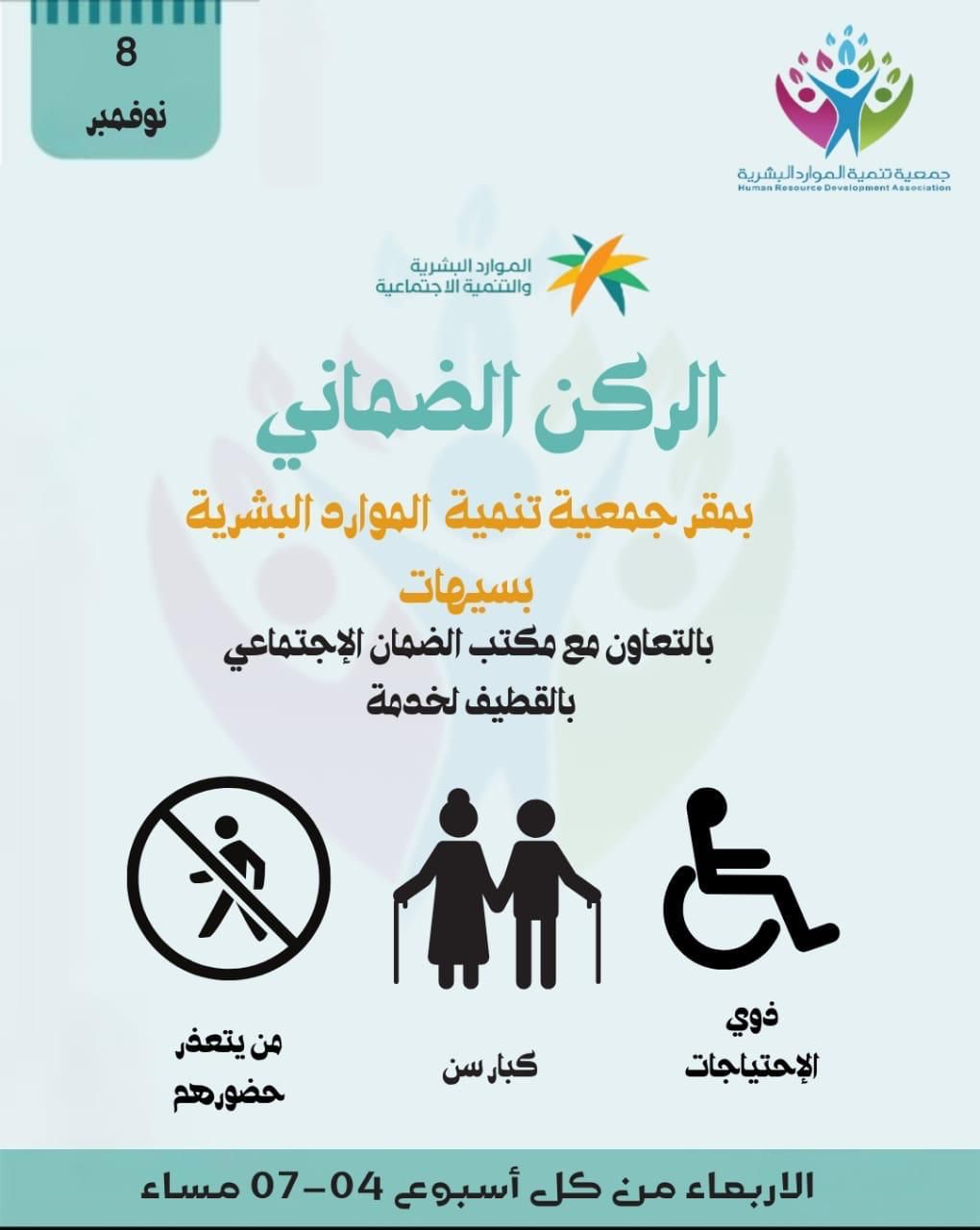 الاربعاء من كل أسبوع *ضمان القطيف يستقبل مستفيديه بجمعية الموارد البشرية بسيهات*