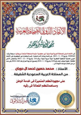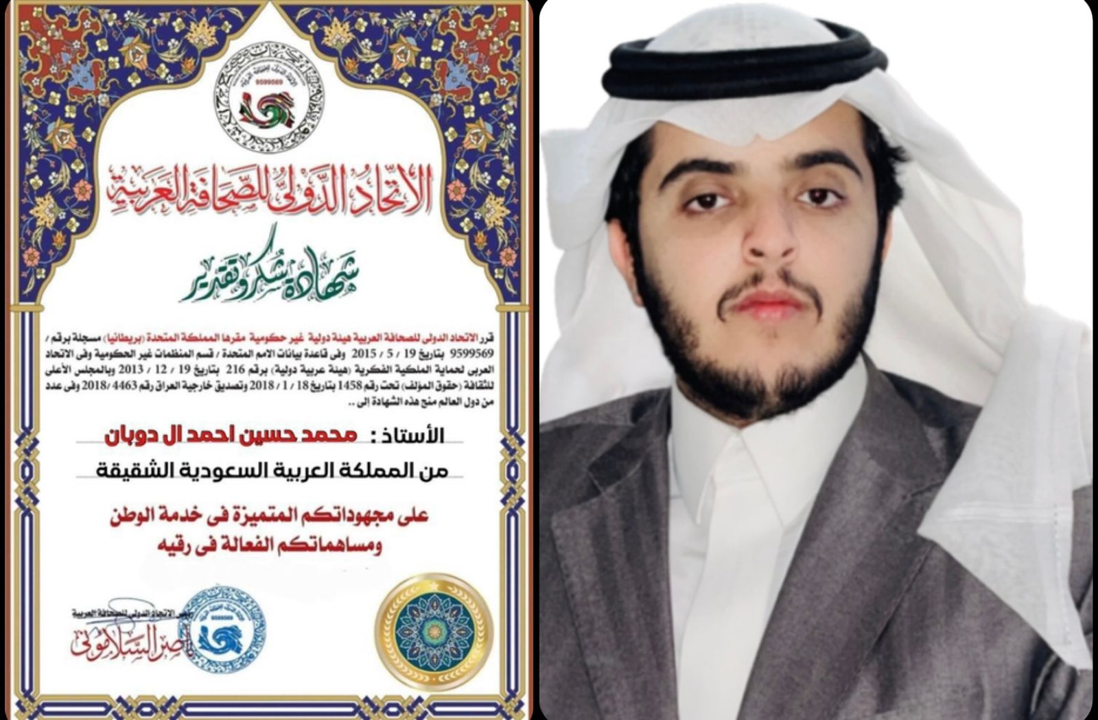 تلقى الإعلامي والكاتب الصحفي الاستاذ / محمد حسين ال دوبان الوادعي شهادة شكر وتقدير من الاتحاد الدولي للصحافة العربية نظيراً لجهوده الصحفية والاعلامية المتميزة في خدمة الدين ثم الوطن ومساهمته الفعالة في رقيه .